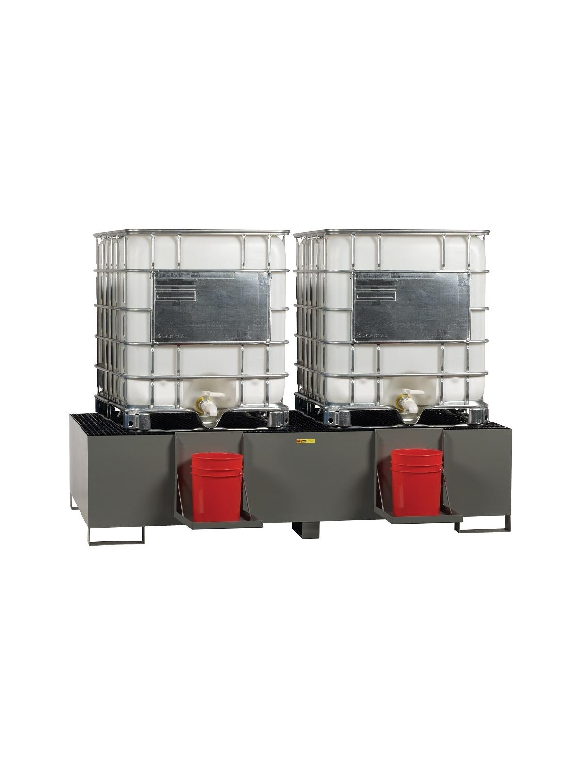 Heavy gauge steel construction for durability and extended life. Steel grating deck panels are easily removed for cleaning. Includes drain plug and grounding screw. Helps you comply with EPA requirements. Single IBC Unit has a large deck surface for additional storage. Three-piece steel grating deck is 29" high. "Convertible" deck allows IBC to be positioned for dispensing within sump area. Included pail holder shelf attaches conveniently to inside or outside of sump. Double IBC Unit can store 2 IBC's side by side, and has a lower profile for easier access. Four piece removable grating deck is 23" high. Includes 2 removable pail holder shelves. FOB Shipping Point.