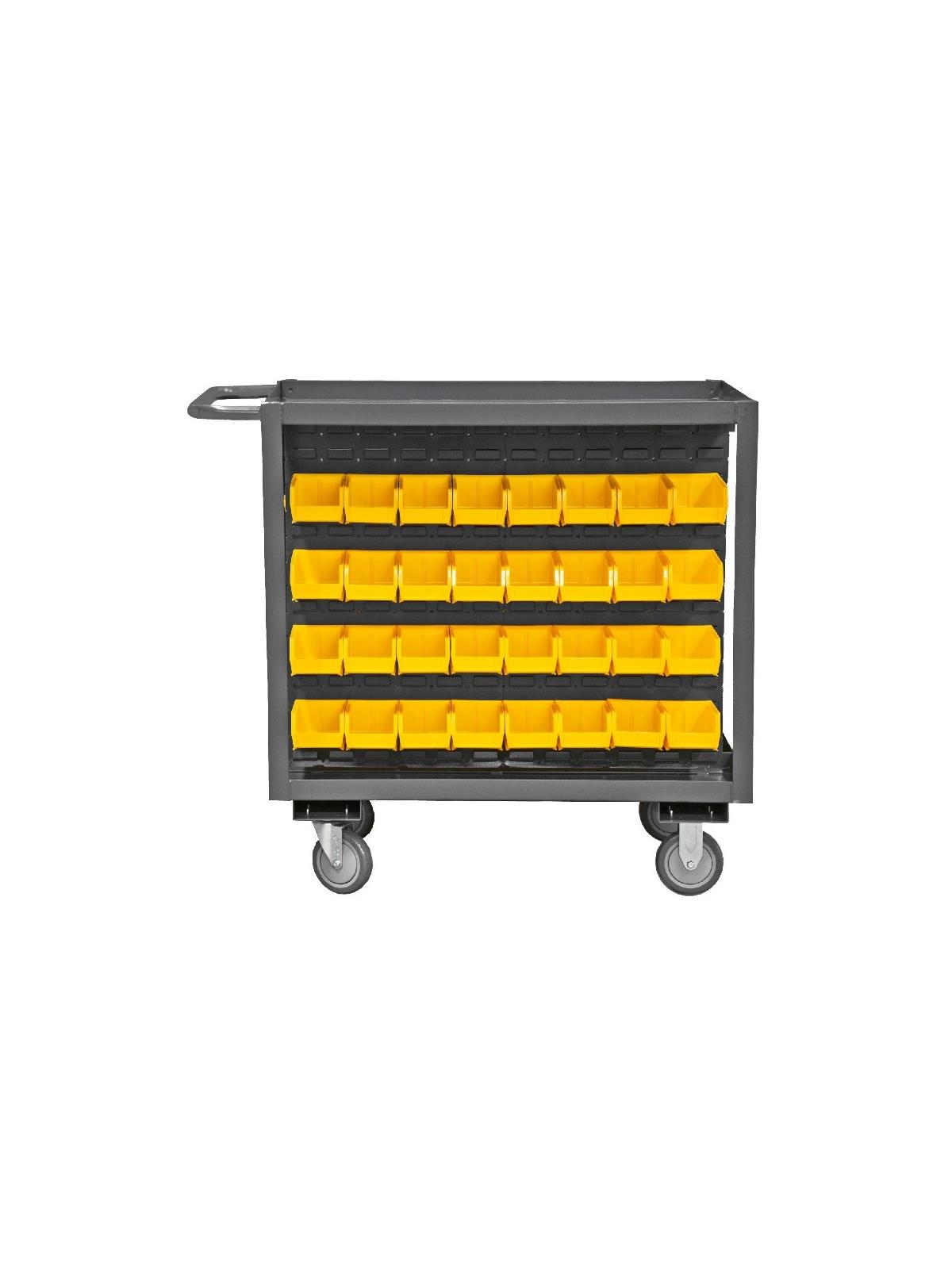 Carts feature 1-1/2" x 1/8" angle iron uprights for added strength. Shelves are heavy duty 14 gauge steel. Sturdy tubular push handle for ease of handling. Durable yellow Hook-On-Bins®. Top surface has 1-1/2" lips up. Louvered center panels accommodate Hook-On-Bins®. Rolls easily on 5" x 1-1/4" polyurethane bolt-on casters, (2) swivel with side brakes and (2) rigid. Ships fully assembled ready to use. Durable, gray, textured powder coat finish. FOB Shipping Point.