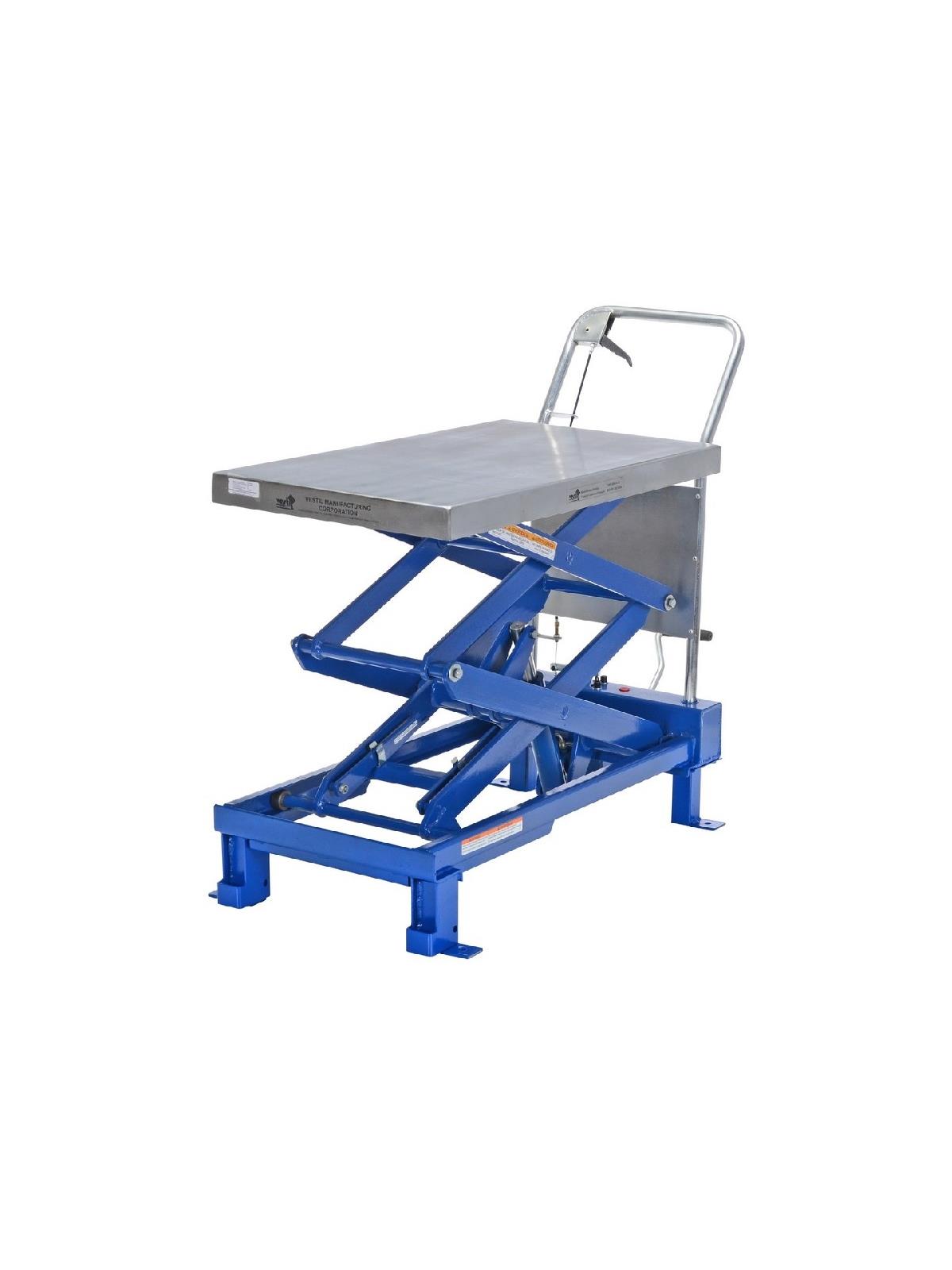 Foot Pump Scissor Lift Tables are used by all types of manufacturing and warehousing facilities. Features torsion tubes for side to side stability, pressure flow control valve for controlled lowering, and foot pump. Rugged welded steel construction. Painted blue finish. FOB Shipping Point.