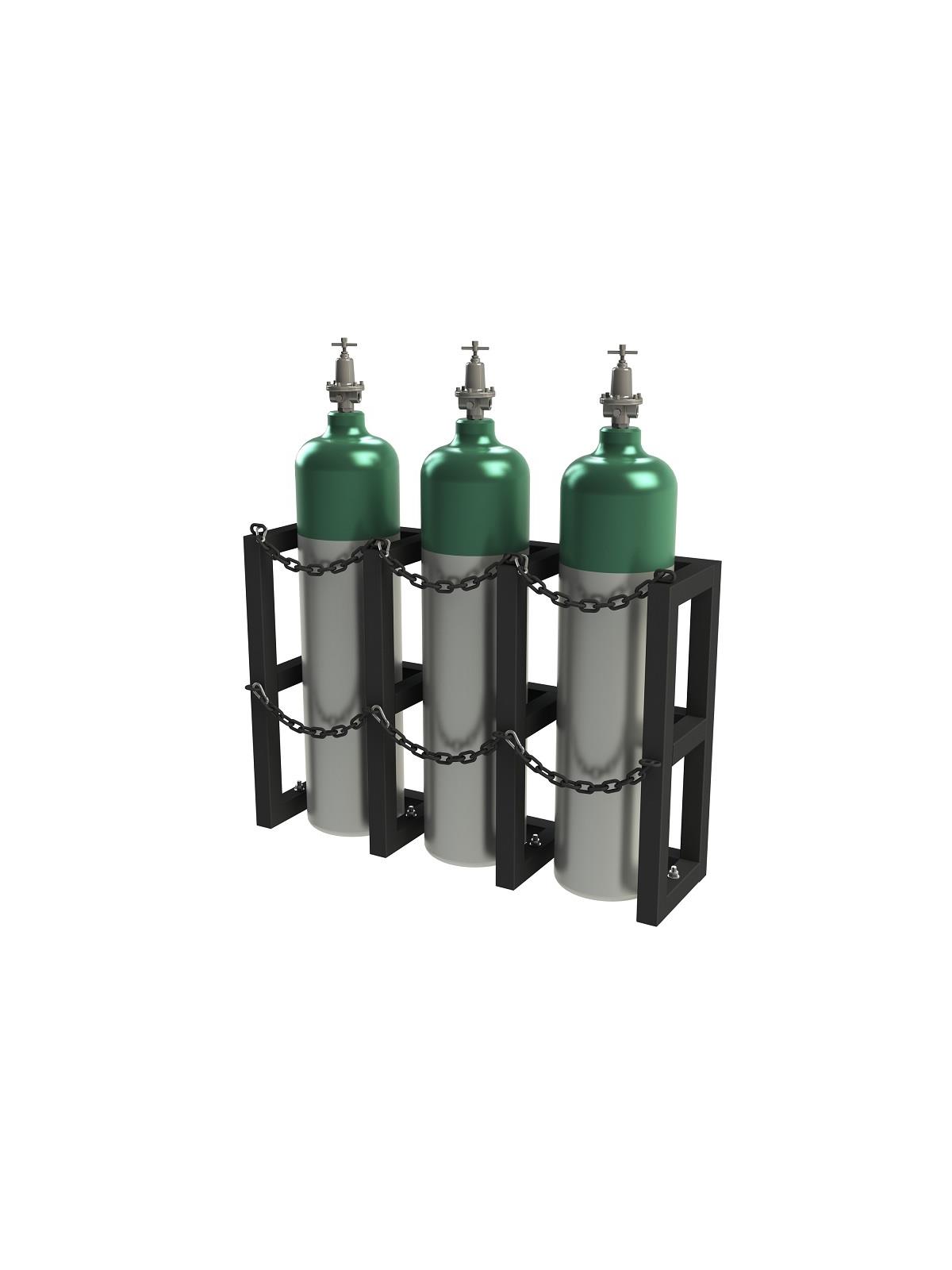 3 gauge, steel tube material can be secured to the floor with included concrete anchors. Includes chains to secure and align the gas cylinders. Organize types in their own rows. Built to meet and exceed quality and safety standards of OSHA, OSHPD, UFC, NFPA and CGA. Ships fully assembled, ready for immediate use. Black, textured, powder coat finish, good for outdoor or indoor use. FOB Shipping Point. Cylinders are not included. Steel surcharges may apply.