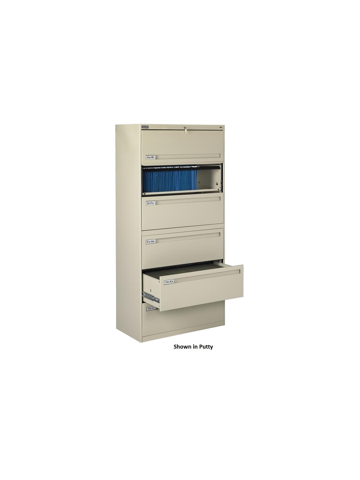 Drawers and doors have easy grip, full-width pulls with recessed label holders. Four leveling glides allow the unit to be leveled on uneven floors. To reduce risk of tipping, order two drawer lateral files with counterweights (suffix "W") for all applications except under a work surface in a workstation. Five and six-high units have retractable door(s) with roll-out drawer on top opening(s). Durable powder-coat paint finish.