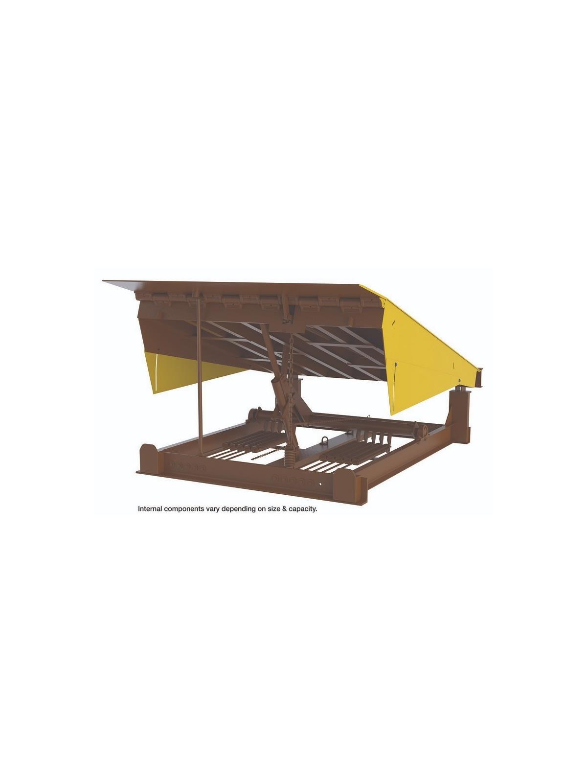 Springs lift dock through a graduated cam ensuring a uniform vertical force. Easy walk down. All heavy duty construction features. Platform is 1/4" non-skid diamond plate (55,000 PSI) steel. 6" structural steel support under-structure for long life. Lip is 16" long with 55,000 PSI steel. Includes steel toe guards on both sides, flush with platform edge. The most dependable dockleveler on the market today. 20,000 lb. load capacity. Capacities to 50,000 lbs. available. Contact for details. FOB Shipping Point.