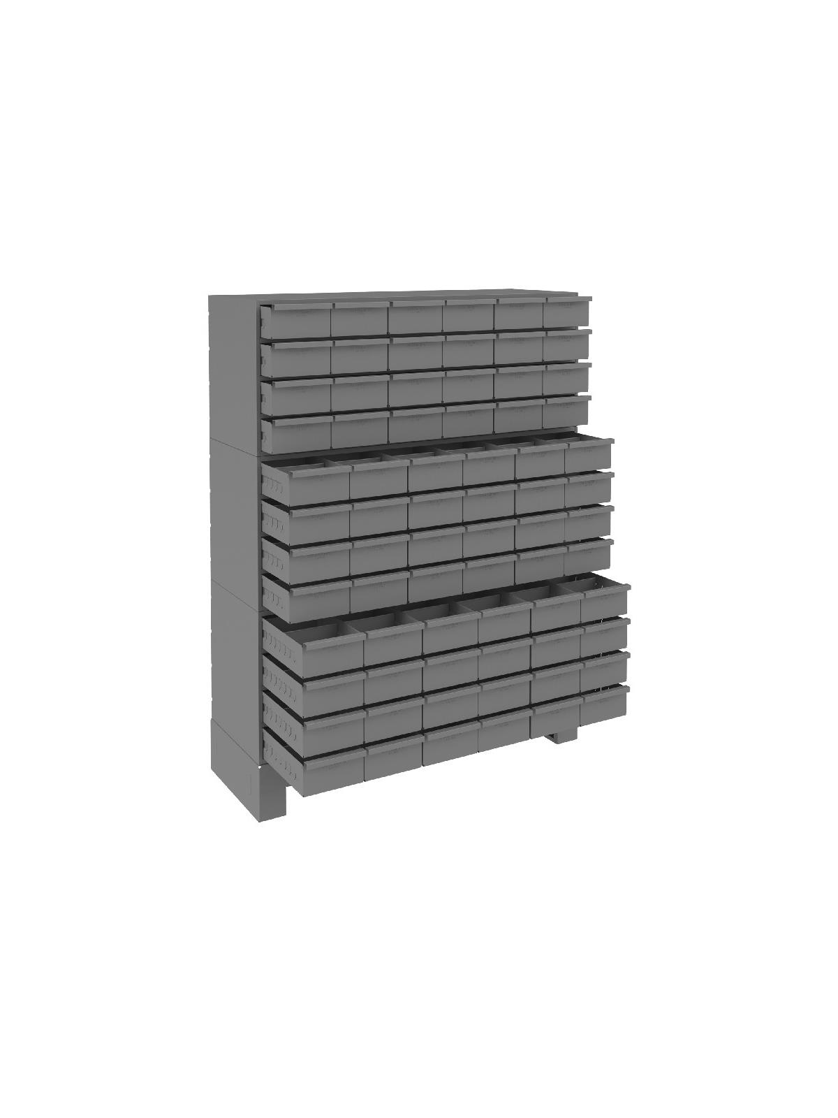 Full-width handle drawers open easily thanks to two embossed runners.  Positive stop prevents spilling. Each drawer comes with 2 dividers. Shipped assembled. Includes base. Gray powder coat finish. FOB Shipping Point.