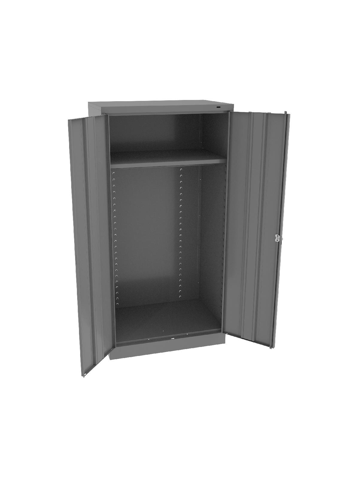 Shelves adjust in 2" increments. Heavy-steel construction with leaf hinges and reinforced doors stand up to a lifetime of heavy use. Handle on right-hand door activates the three-point locking system to keep belongings secure. Raised base keeps contents from contacting moisture from the floor. Available in 3 models--storage, wardrobe and combination. Available in Black, Champagne/Putty, Sand, Light Gray and Medium Gray. FOB Shipping Point. Surcharge may apply. See Related Items tab for extra shelves.